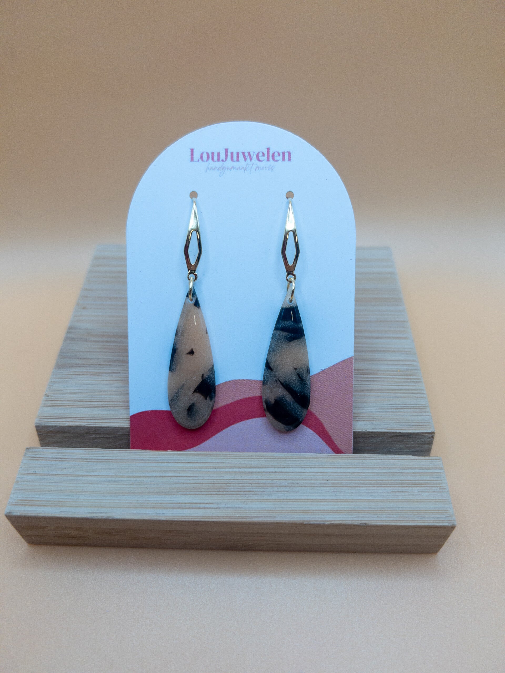 Gemaakt uit polymeerklei in een speels tortoise shell patroon en afgewerkt met uv resin en stainless steel onderdelen; ideaal dus voor dagelijks gebruik zonder verkleuren.